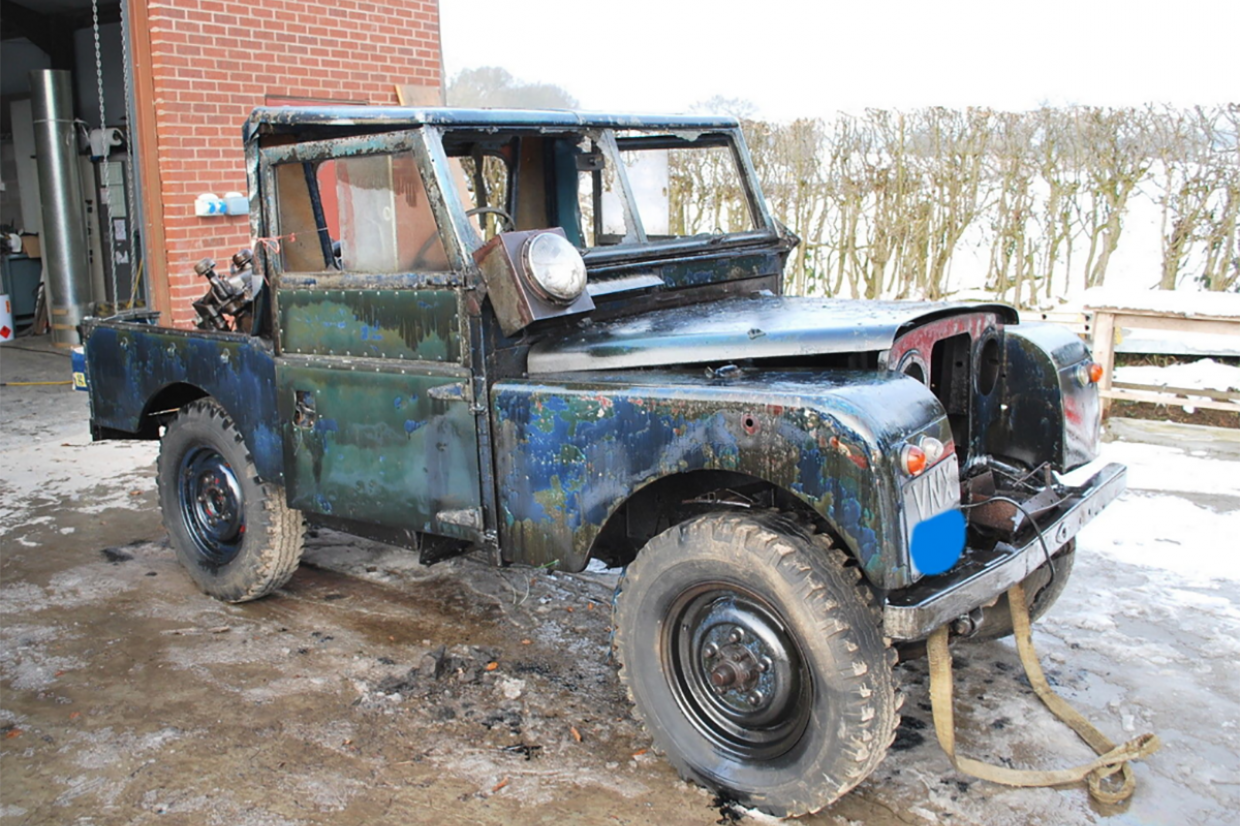 Chassis ‘116700001’ was completed on 15 January 1957 in green, but you’d be hard-pressed to tell from its current condition, which is described generously as ‘unrestored’. With smashed glass and doors of the home made truck cab held on with bailing twine, it’s safe to say any restoration would need to be extensive. The engine, which comes from a contemporary Land-Rover, sits in the rear rather than the engine bay, while the rear cross member is damaged and the bulkhead needs rebuilding.