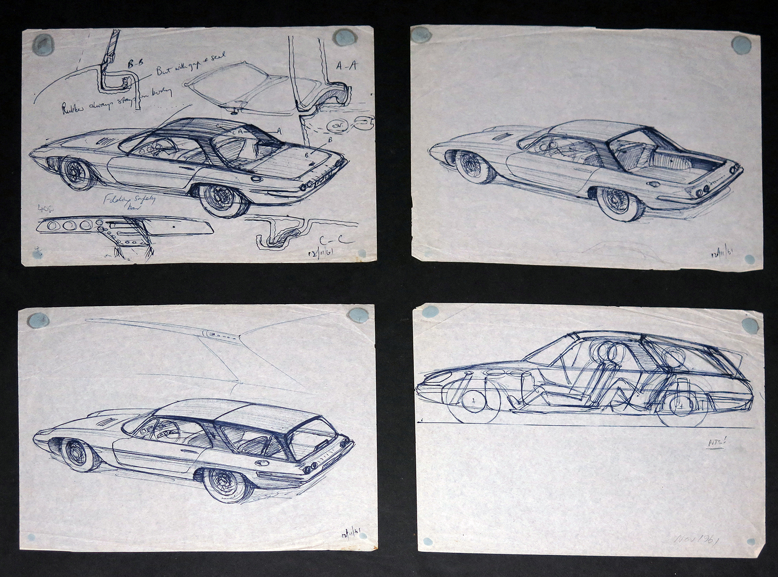 The sketches and designs show early workings of the Europa, Elan and Elan 2+2, among others