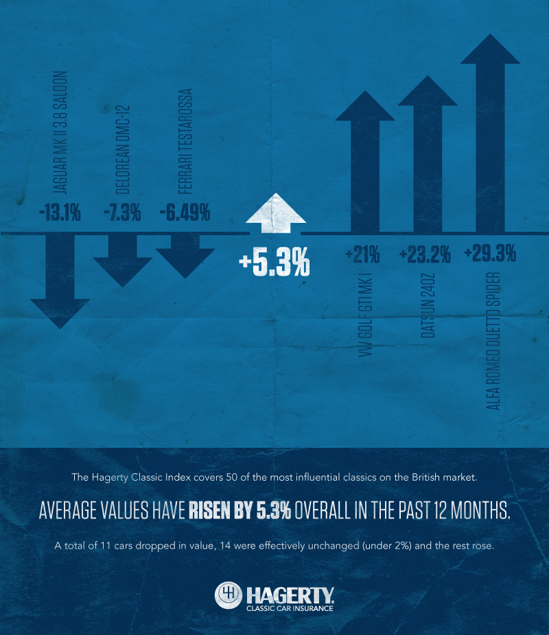 It is interesting to look at those cars that fell, and those that rose most in the 12-month period. The Jaguar Mk II 3.8 Saloon dropped 13.1%, a trend that is in keeping with other Jaguars that had risen very strongly in recent years. The DeLorean DMC-12 dropped by 7.3%, and the Ferrari Testarossa by 6.49%, in common with many other 1980s Ferraris.